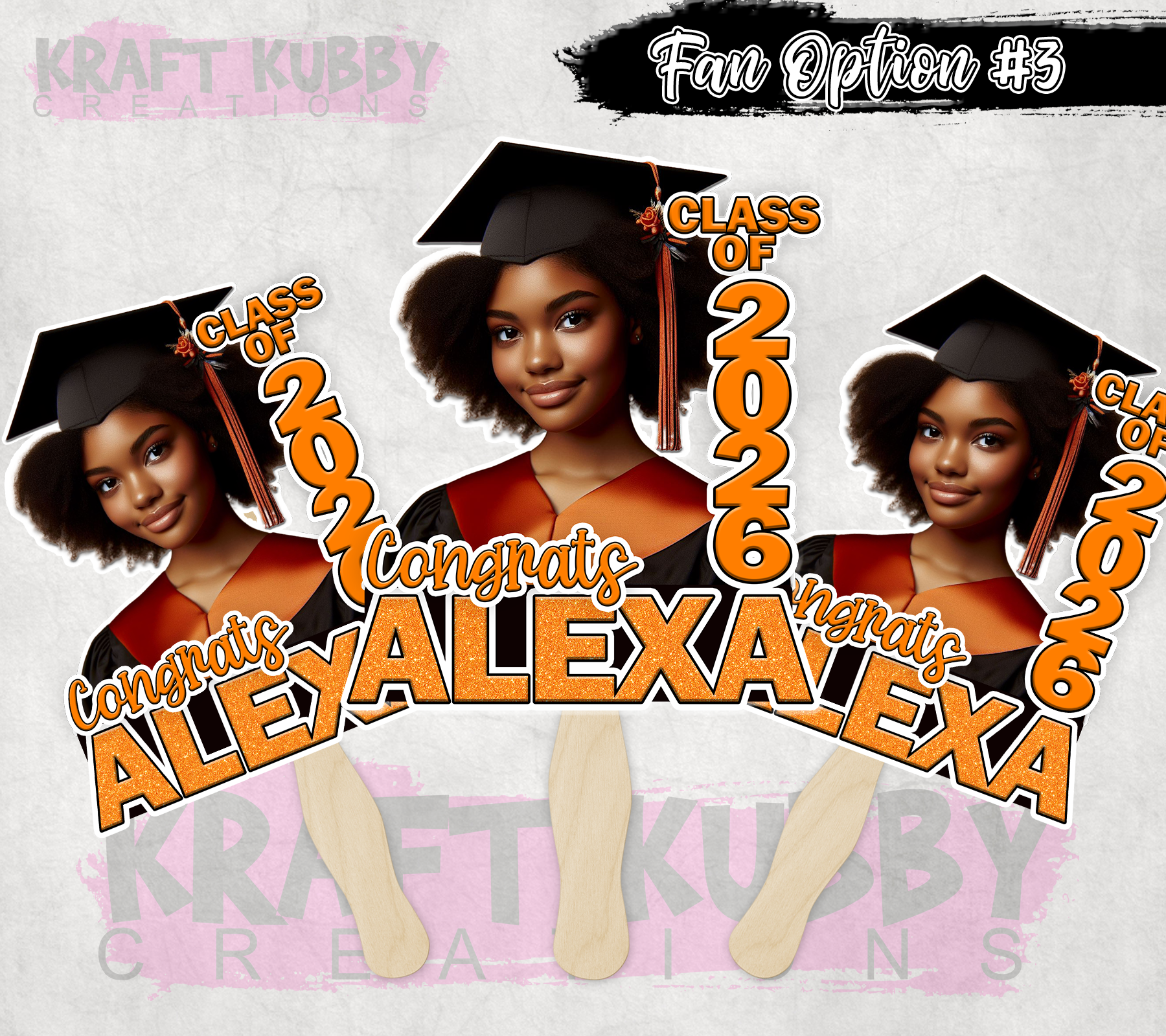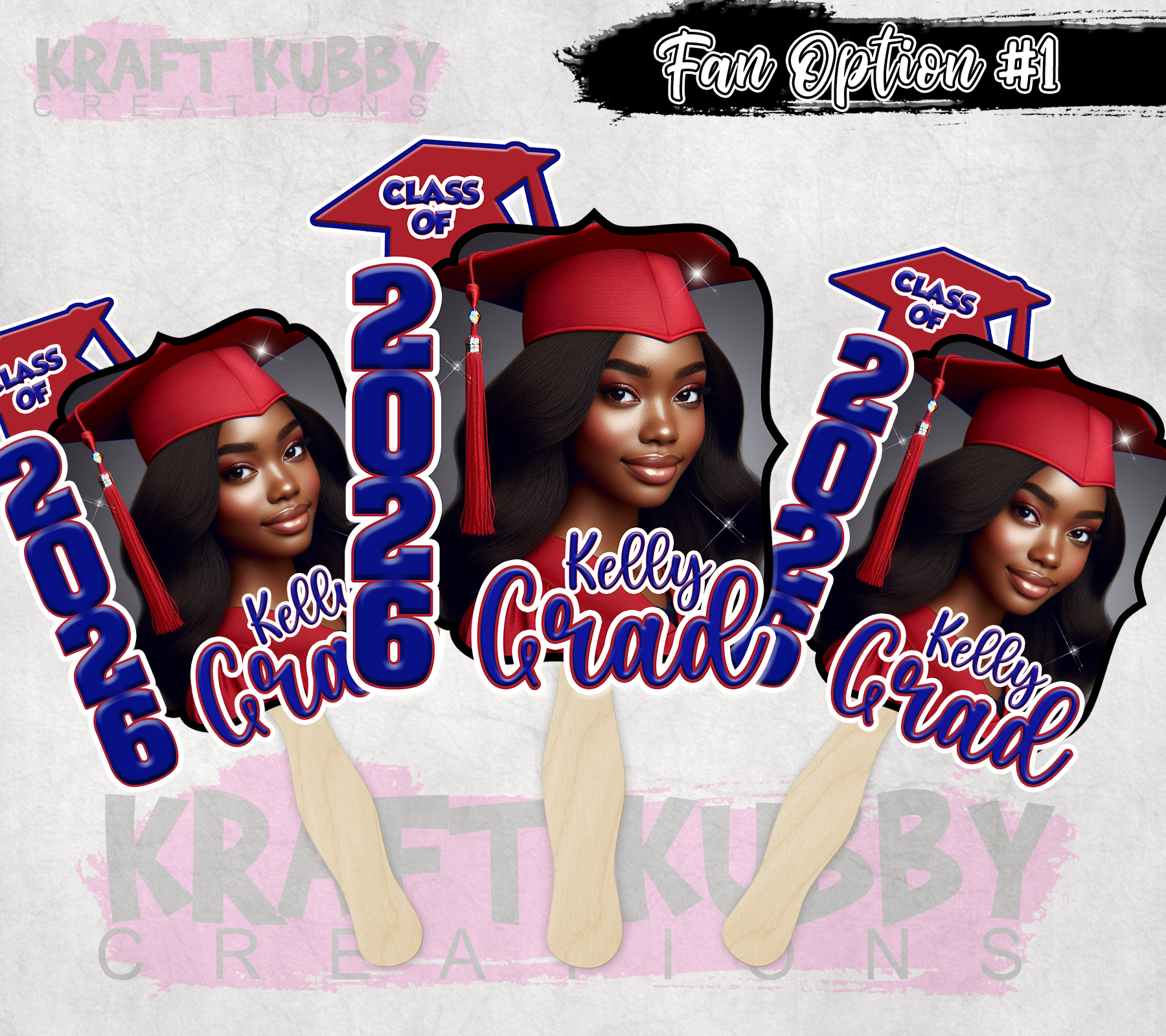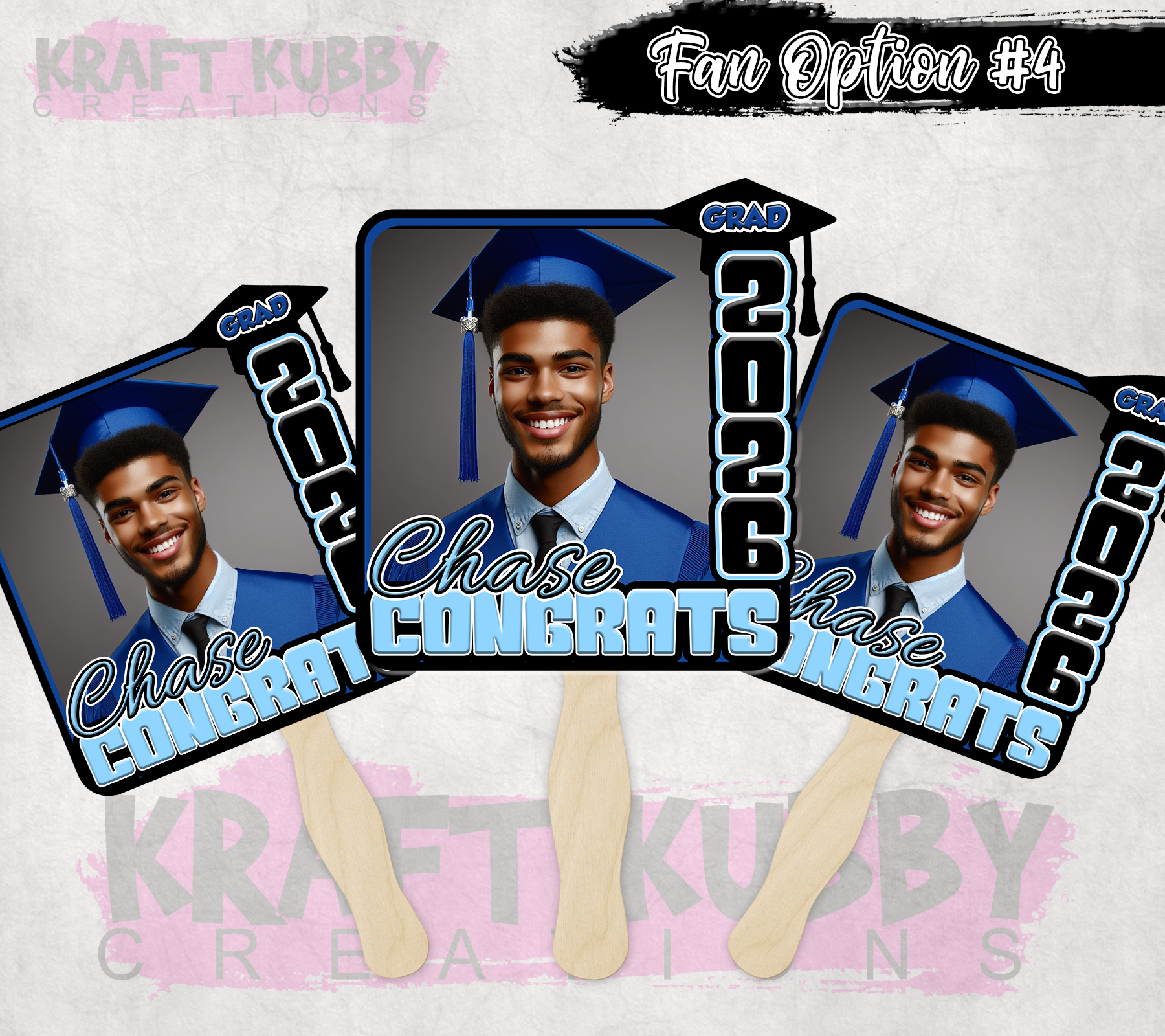 Do you have a pre-school, elementary school, high school or college graduate this year?? Graduation fans are the perfect keepsake and gift for you or someone you know! Celebrate their achievements and stand out from the rest. Fans are personalized with your person's picture, name, school, year, and/or mascot...they can be made any way that you'd like.